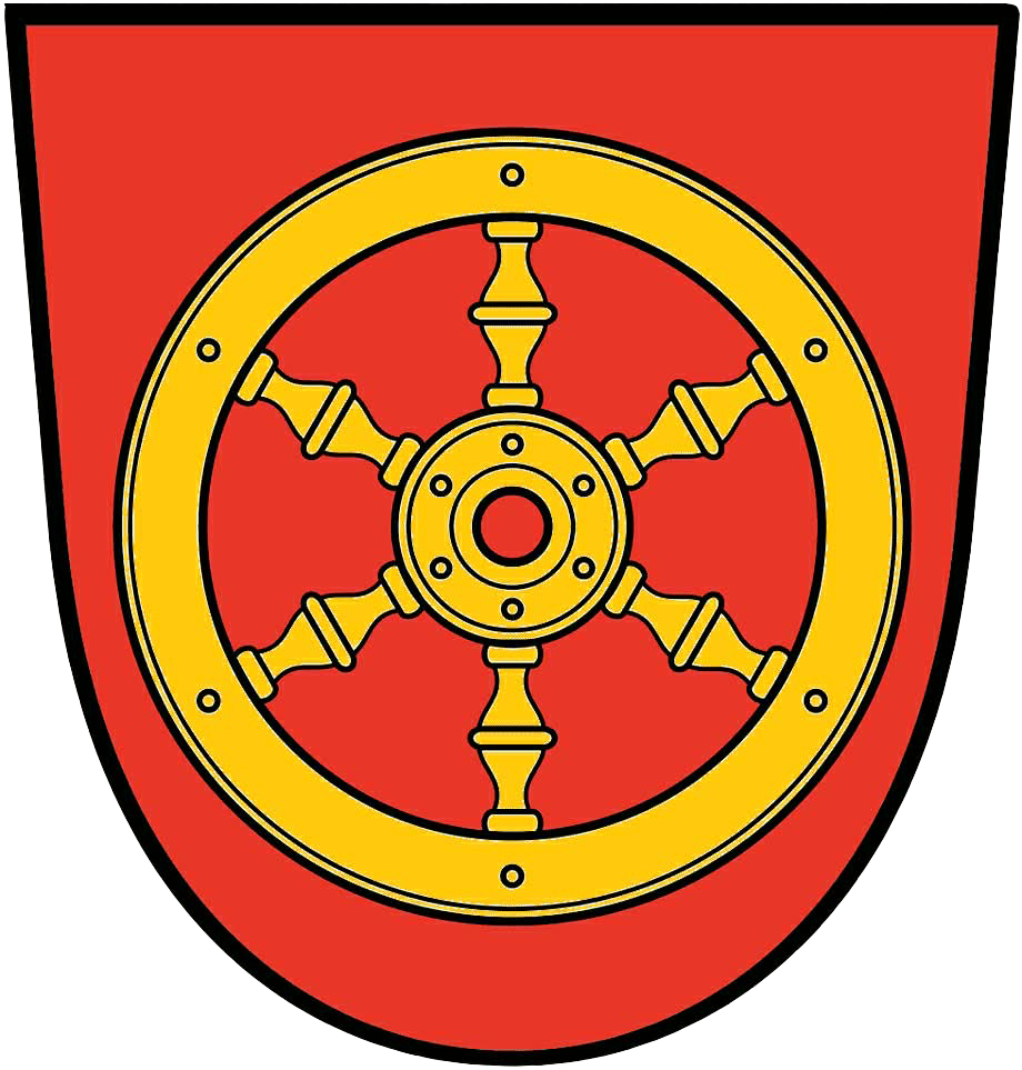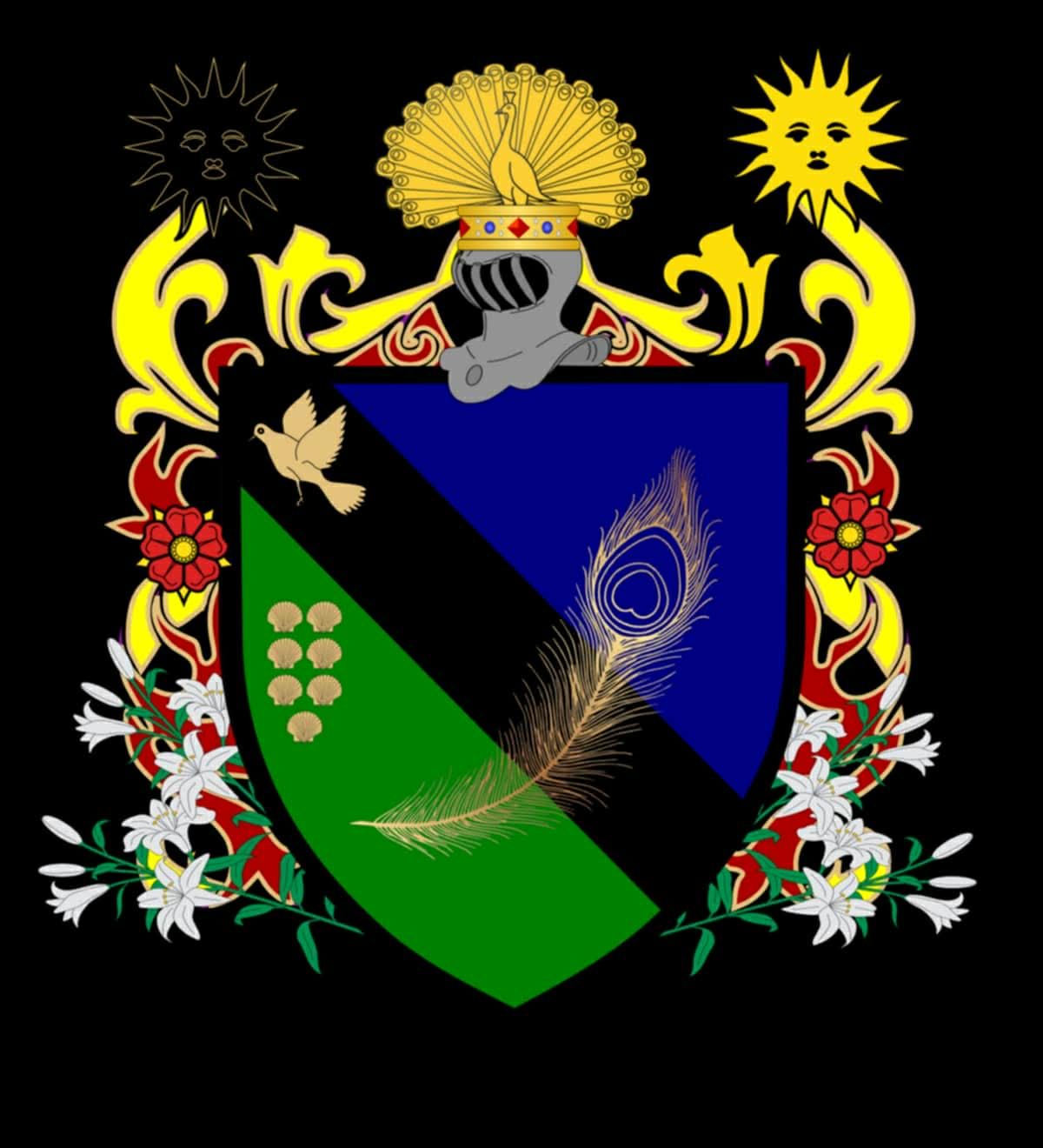 Stemma: scudo dorato con bordo azzurro, circondato da ferri di cavallo argentati