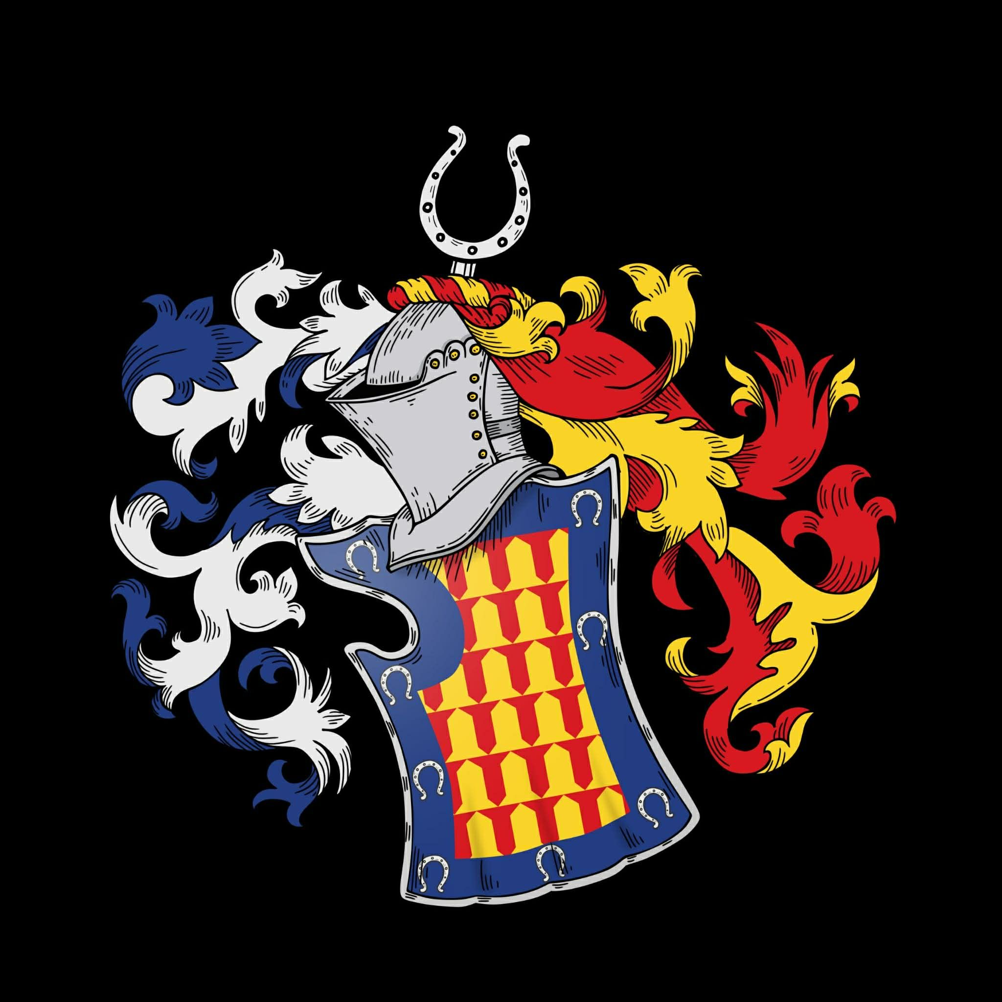 Stemma: scudo dorato con bordo azzurro, circondato da ferri di cavallo argentati